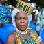 גבר הנושא על ראשו תלבושת מסכה טקסית מורכבת בפסטיבל ימי הוודו באוידה, בנין 2026